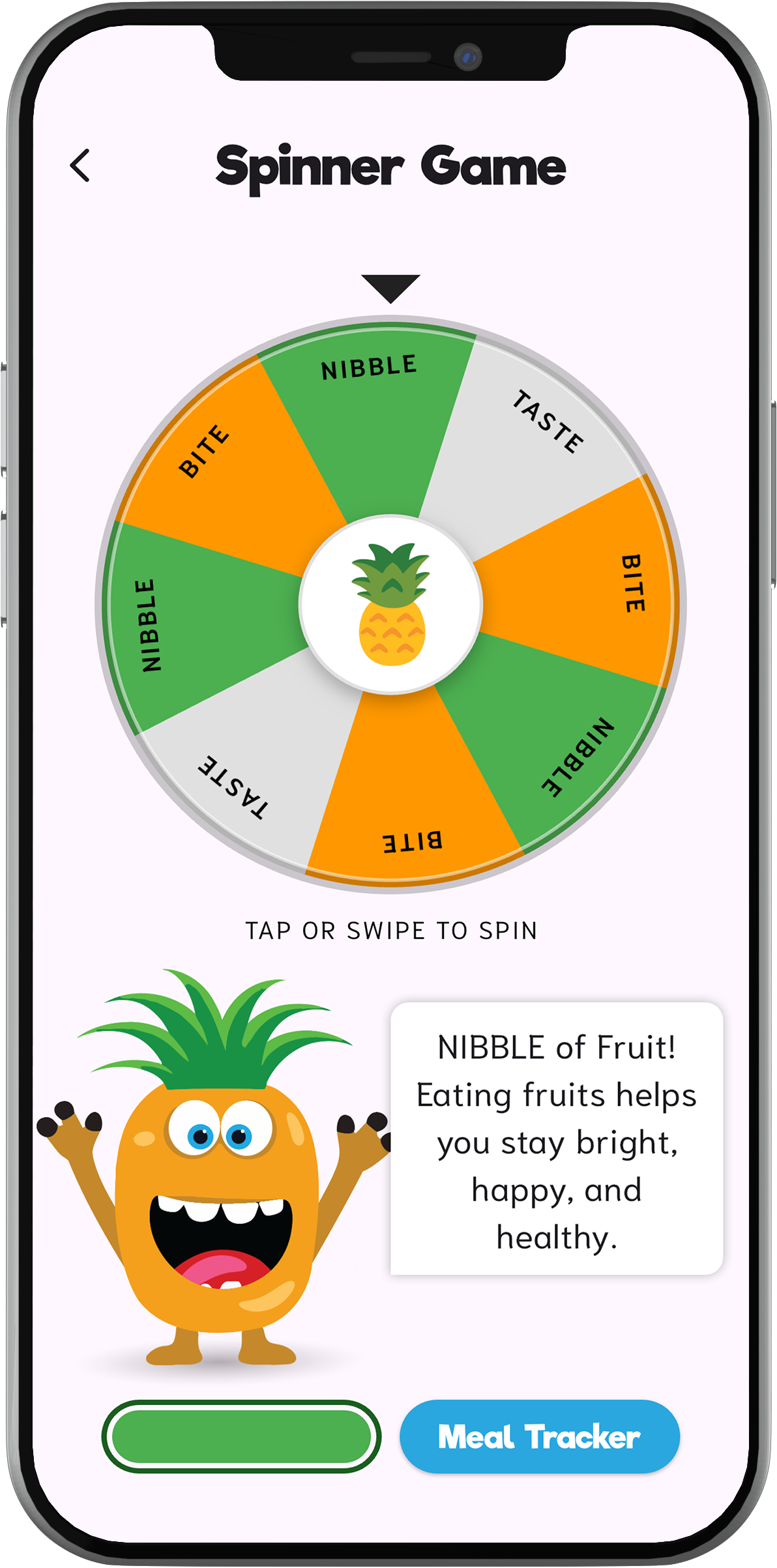 - Spinner Game - kids spin to reveal surprise food challenges that encourage variety and discovery.